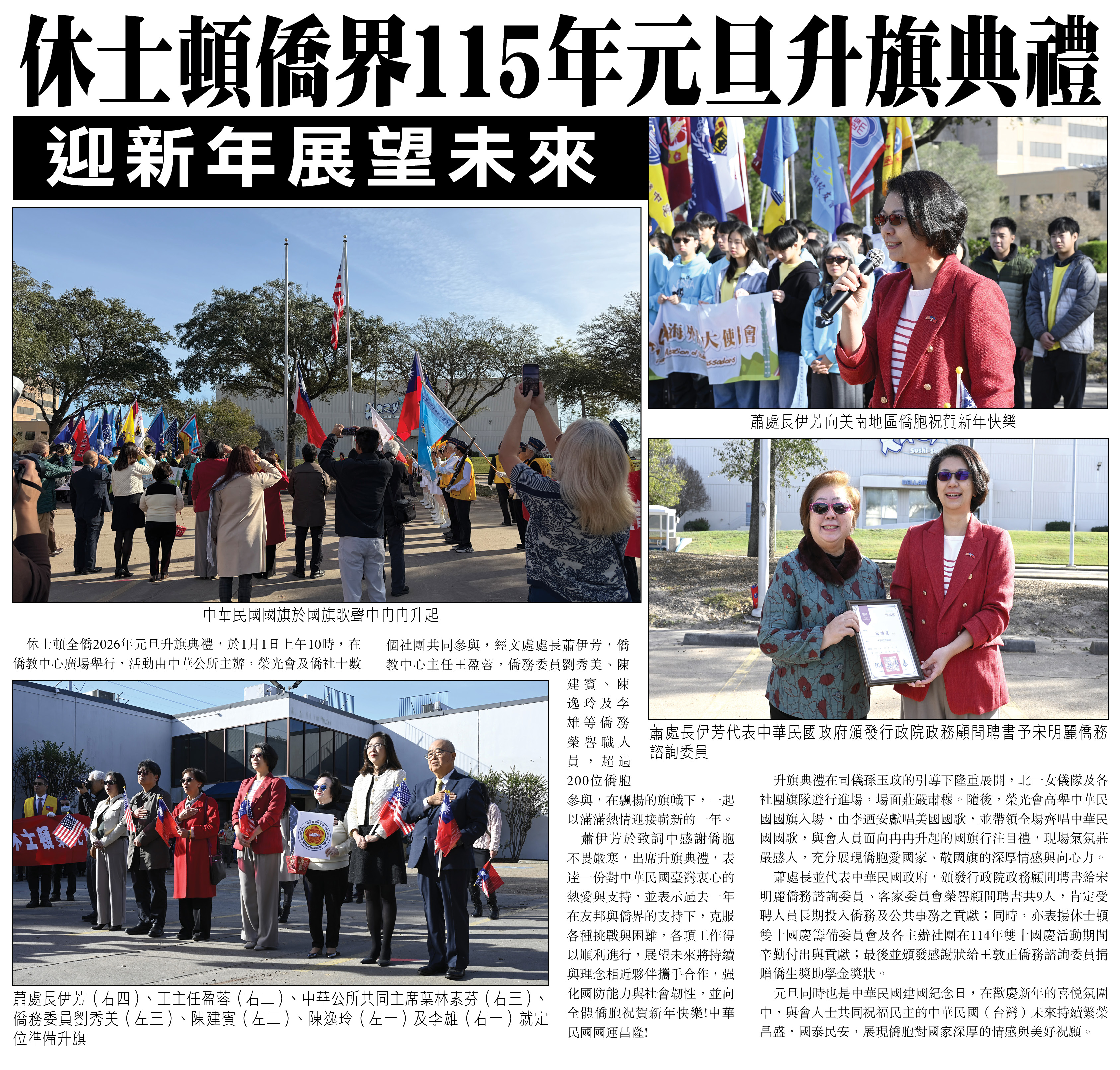 休士頓全僑2026年元旦升旗典禮,於1月1日上午10時,在僑教中心廣場舉行,活動由中華公所主辦,榮光會及僑社十數個社團共同參與,經文處處長蕭伊芳,僑教中心主任王盈蓉,僑務委員劉秀美、陳建賓、陳逸玲及李雄等僑務榮譽職人員,超過200位僑胞參與,在飄揚的旗幟下,一起以滿滿熱情迎接嶄新的一年。