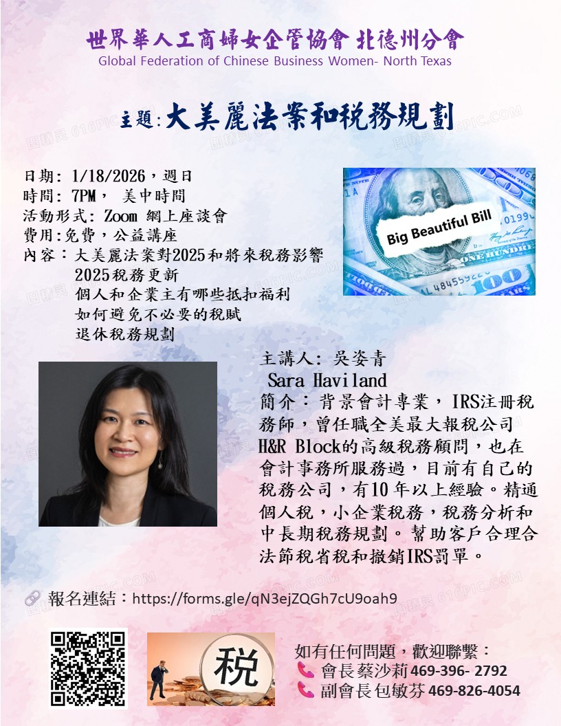 世界華人工商婦女企管協會北德州分會將於 2026 年 1 月 18 日(星期日)晚間 7 點 舉辦線上稅務專題公益講座,主題為 「大美麗法案與稅務規劃」。本次講座特別邀請擁有超過十年實務經驗的 IRS 註冊稅務師 吳姿青(Sara Haviland) 擔任主講人,本會將透過 Zoom 線上方式進行,全程免費,歡迎有興趣的民眾踴躍參加。