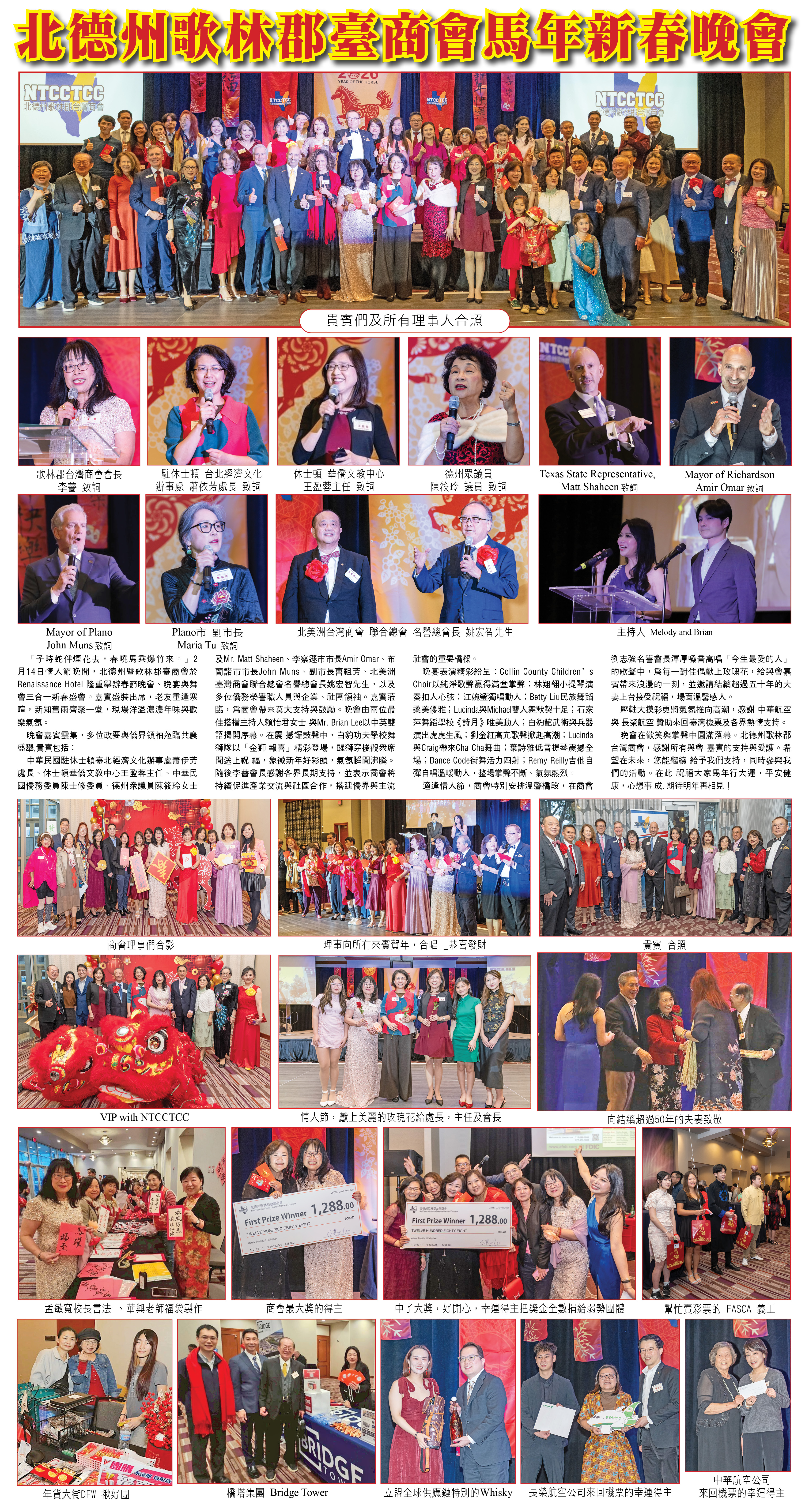 「子時蛇伴煙花去,春曉馬乘爆竹來。」2月14日情人節晚間,北德州暨歌林郡臺商會於 Renaissance Hotel 隆重舉辦春節晚會、晚宴與舞會三合一新春盛會。嘉賓盛裝出席,老友重逢寒暄,新知舊雨齊聚一堂,現場洋溢濃濃年味與歡樂氣氛。